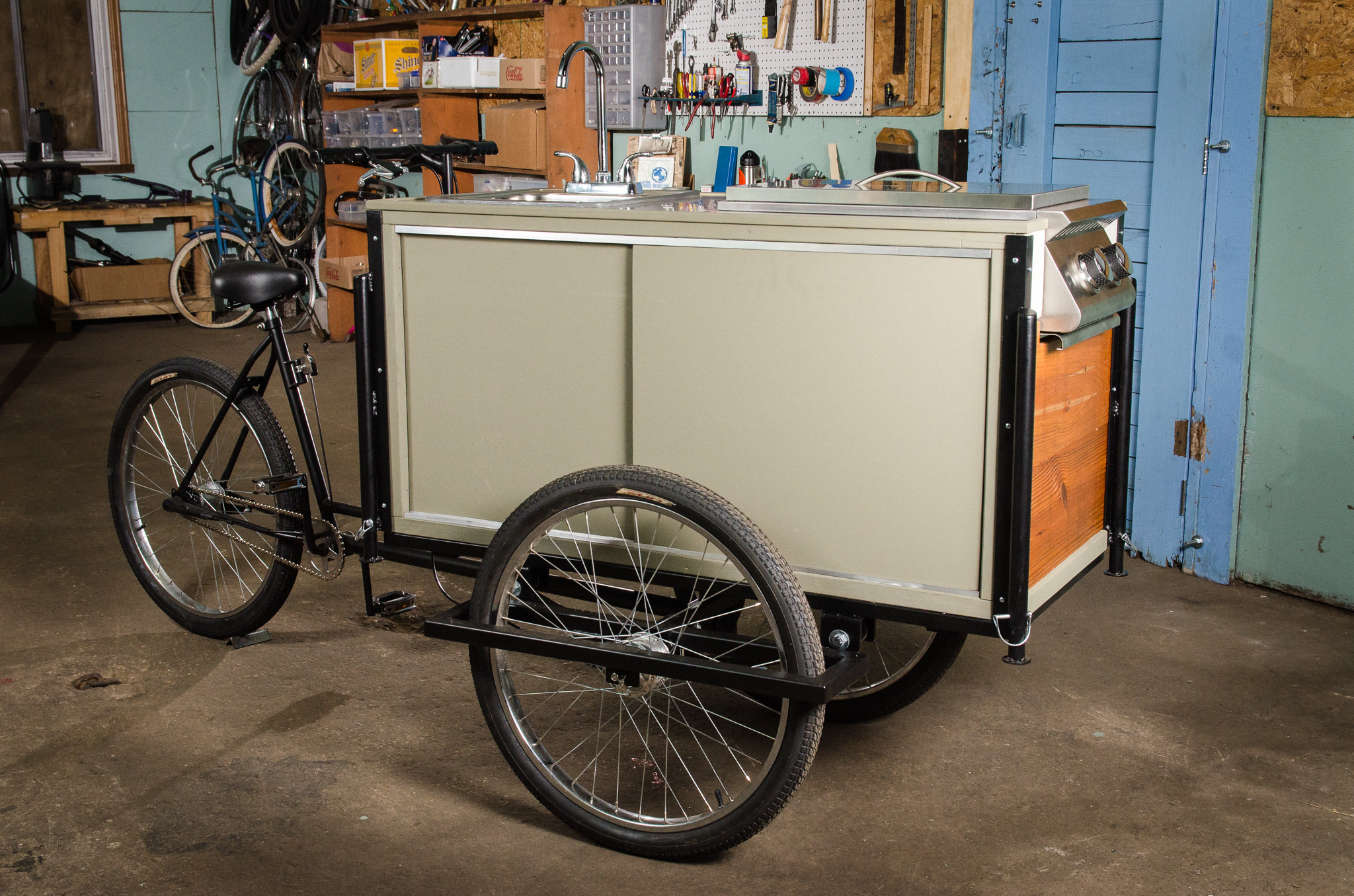 The really exciting news is that we’ll be bringing a brand new model to show off for 2014. Given our recent success in building an espresso cargo bicycle for TOMS’ new coffee product roll out, and another coffee cargo bicycle for a small craft coffee roaster in Salt Lake City, Utah, we decided that we needed to create a three wheeler with the family in mind.